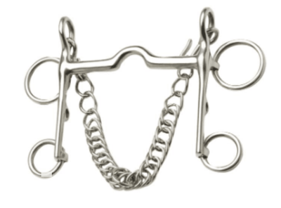 Stainless steel. Ideal for the show hack that dislikes two mouth pieces. This model has the same action as a ported pelham bit, but with the look of a bit and bradoon due to the shank design. It comes complete with a double link curb chain.